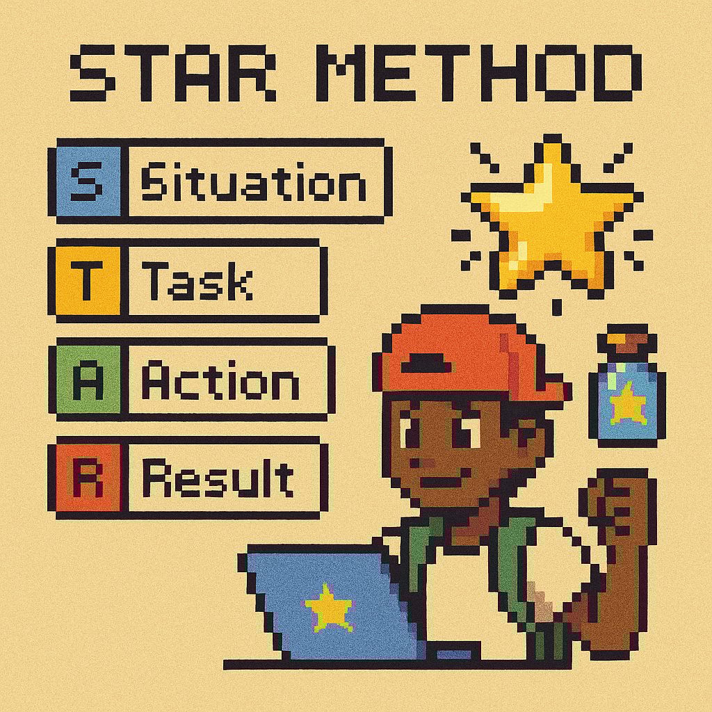 STAR method template → Draft 3–4 stories with Situation, Task, Action, Result.
